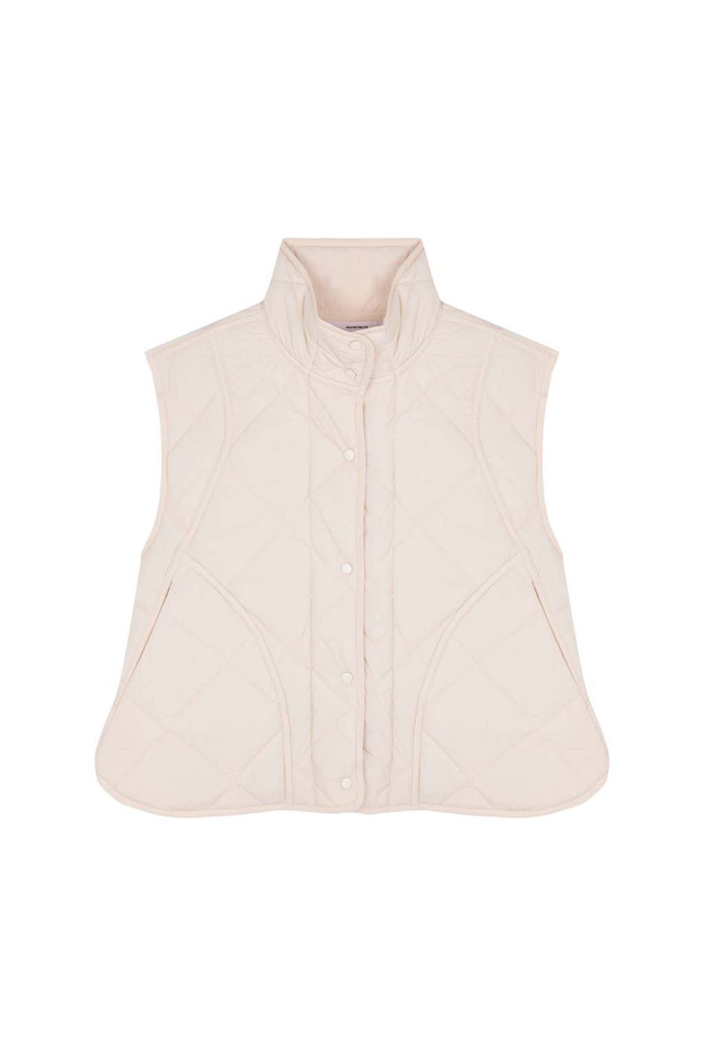 Voľná prešívaná vesta s vysokým golierom z jemného textúrovaného materiálu. Veľmi teplá a pohodlná. Skombinujte ju s nohavicami z tej istej kolekcie a vytvorte tak štýlový look.