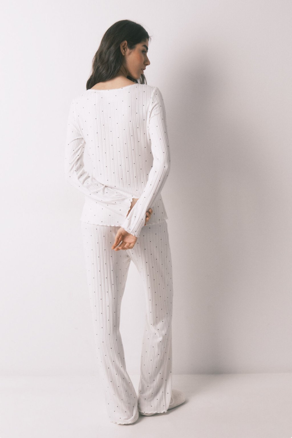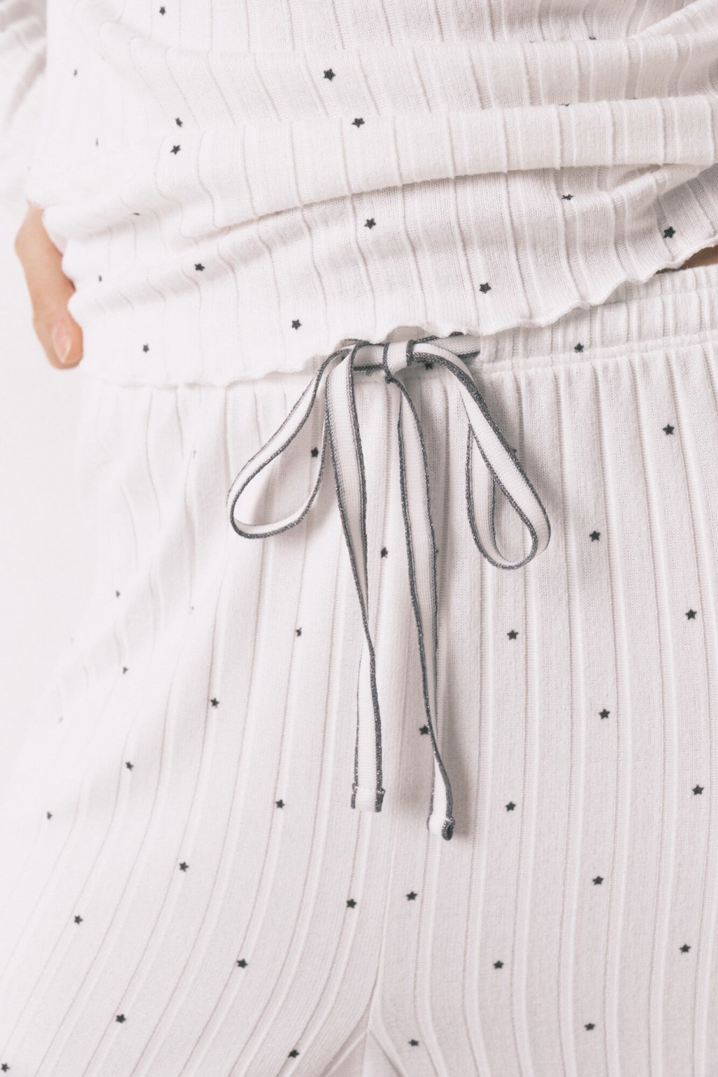 Dlhé pyžamo so vzorom hviezdičiek a motívom Malý princ. Vyrobené z jemného a príjemného rebrovaného materiálu. Top s okrúhlym výstrihom a detailom výšivky na hrudi a leme. Nohavice s elastickým pásom, prispôsobiteľnou šnúrkou a detailom zberkania na leme. Hlavný materiál obsahuje minimálne 50% recyklovaných polyesterových vlákien.