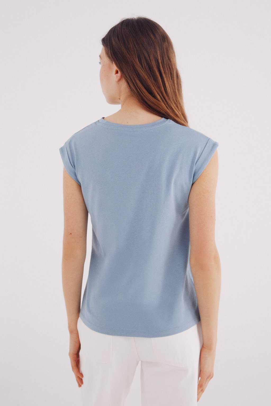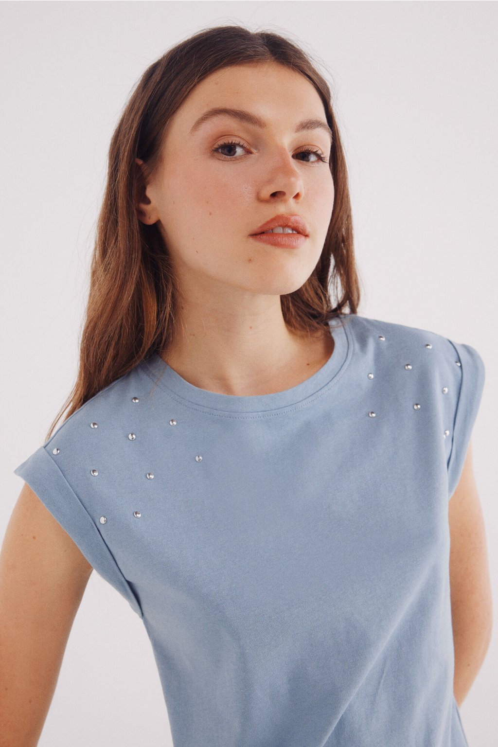 Jednofarebné tričko s krátkym rukávom, okrúhlym výstrihom a detailom ozdobných kamienkov na pleciach.