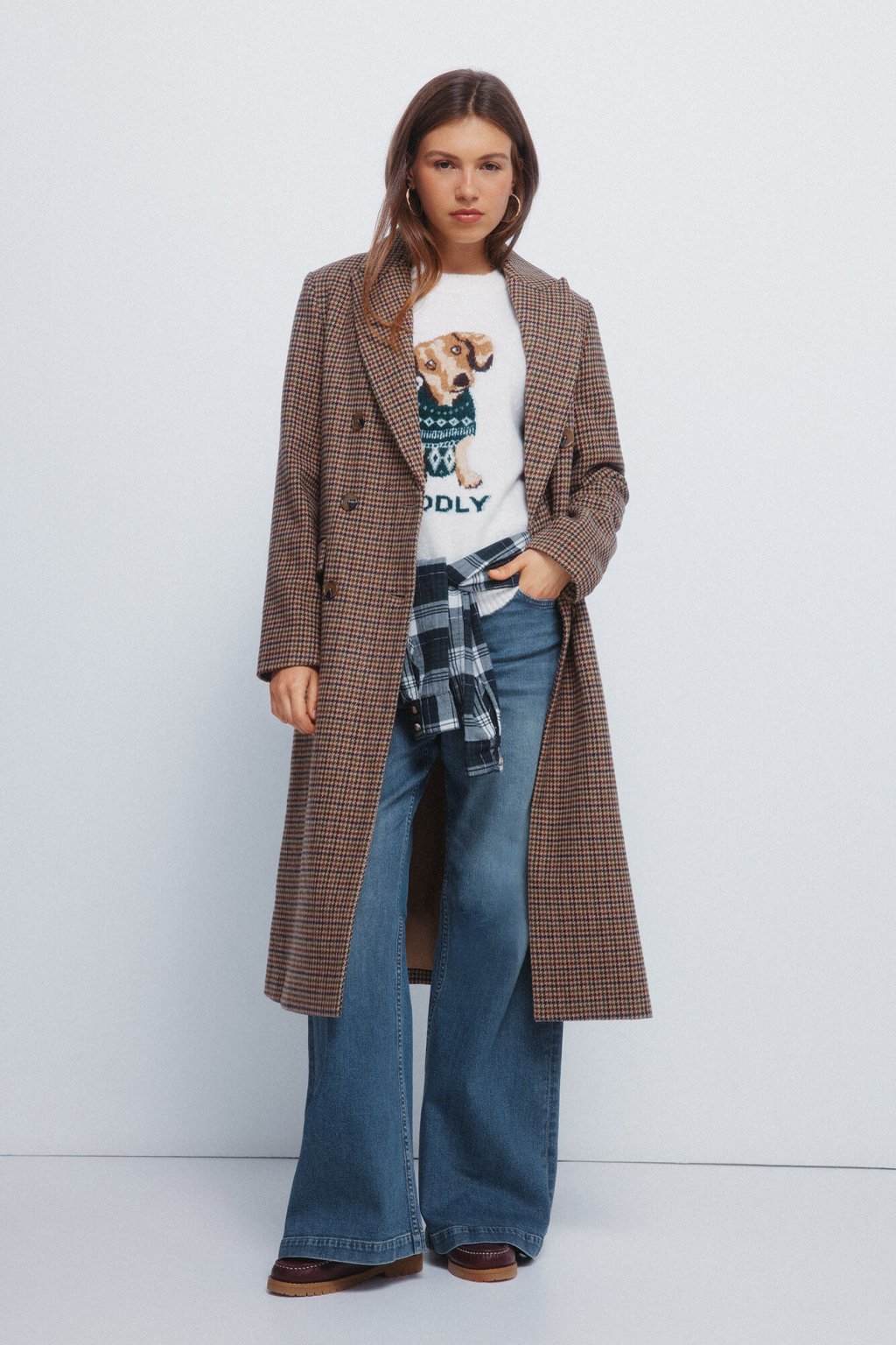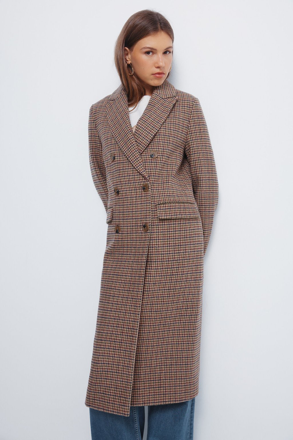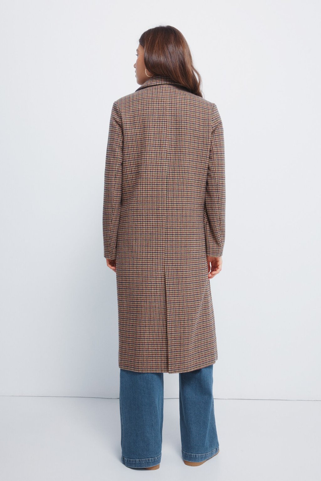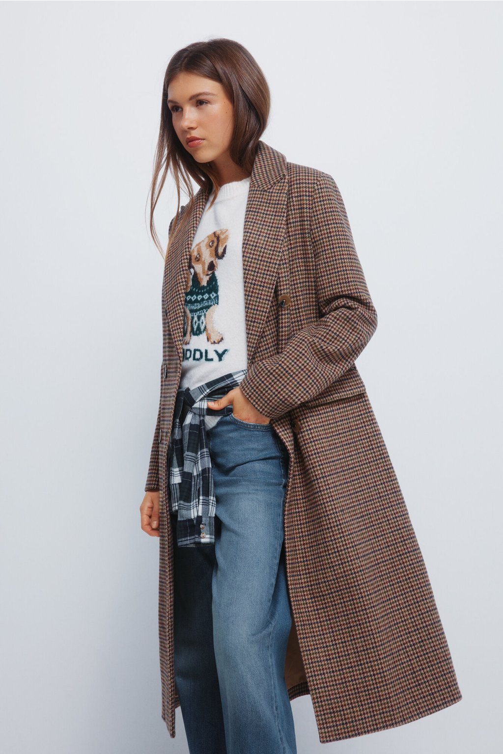 Dlhý kockovaný kabát s dvojradovým zapínaním