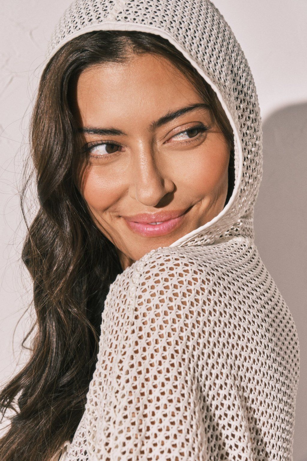 Tunika s kapucňou z materiálu s džersejovým efektom. S ladiacim detailom rúrkovania, rozparkami po bokoch, detailom prekríženia na krku, prispôsobiteľnou šnúrkou a ladiacim pútkom.