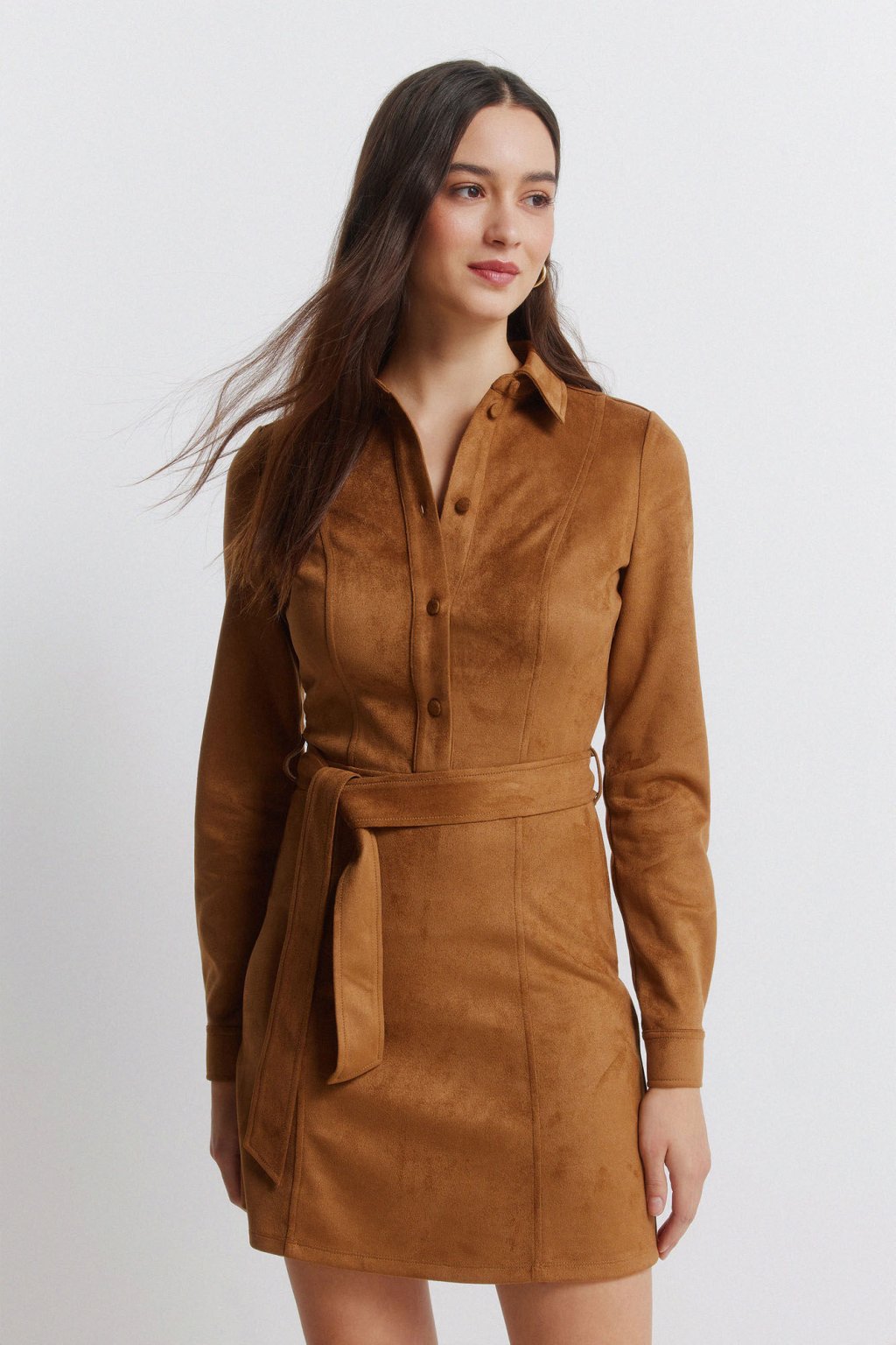 Krátke šaty s dlhým rukávom, Fitted strihom, golierom, zapínaním na gombíky na prednej strane, opaskom a širokou sukňou.