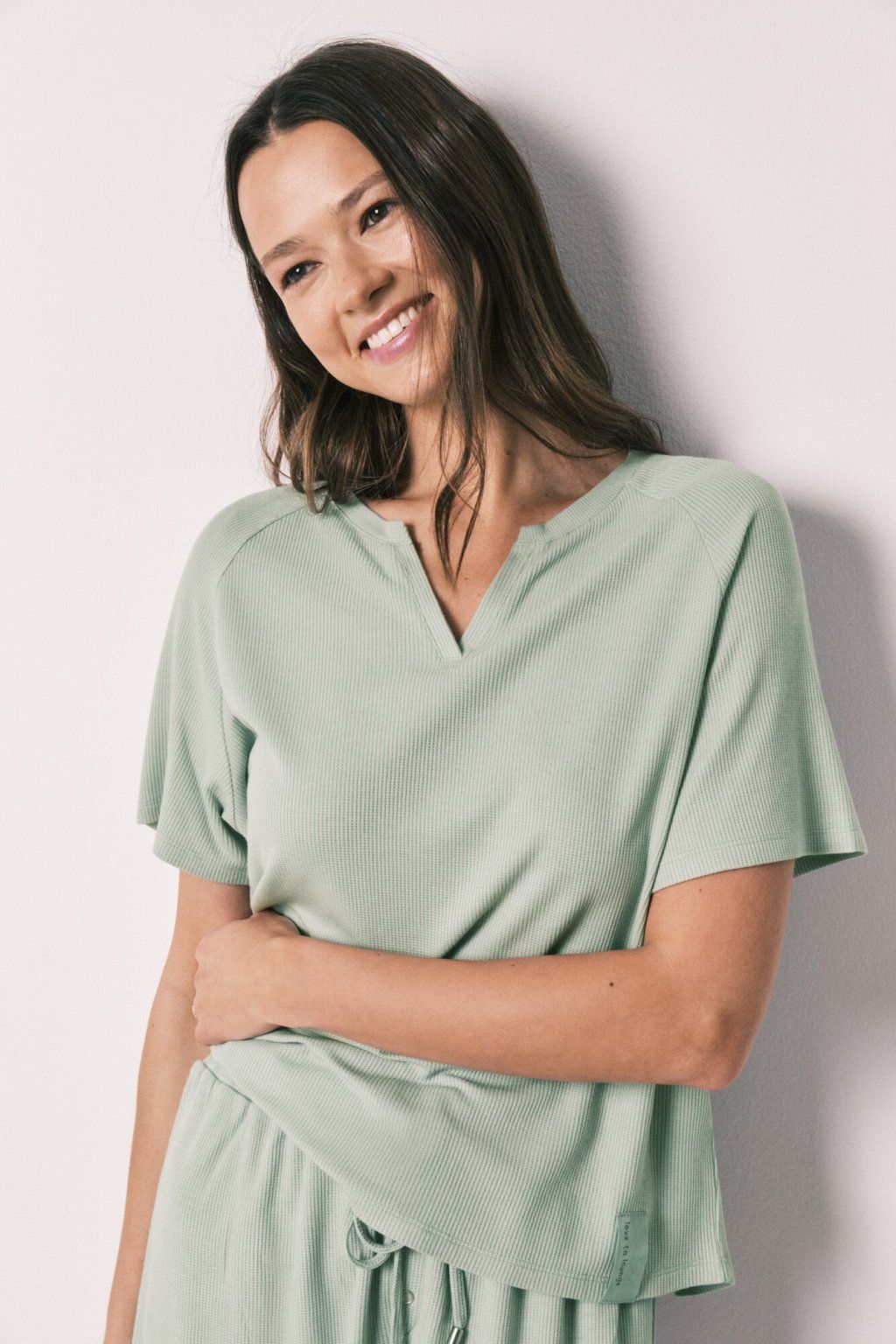 - Top s okrúhlym výstrihom, rukávmi v raglan štýle a ozdobným motívom na leme.