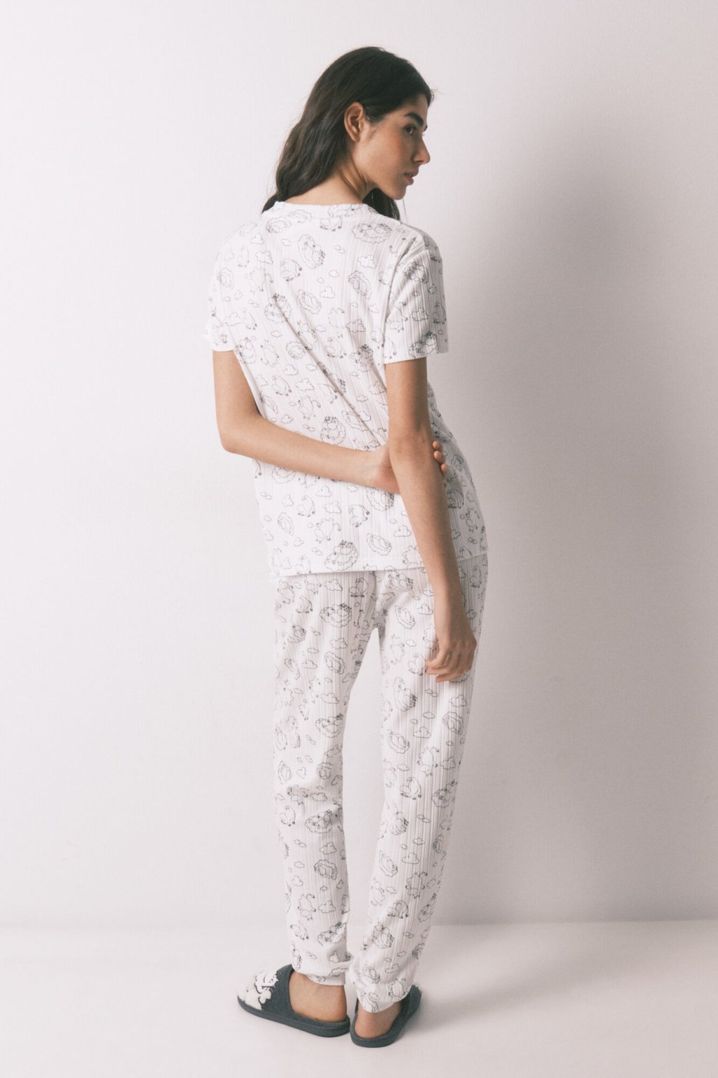 Pyžamo s krátkym rukávom s motívom Moomin. Vyrobené z jemného a príjemného rebrovaného materiálu. Top s Loose Fit strihom a V výstrihom. Nohavice s elastickým pásom, prispôsobiteľnou šnúrkou a podohnutým lemom. Hlavný materiál obsahuje minimálne 50% recyklovaných polyesterových vlákien.