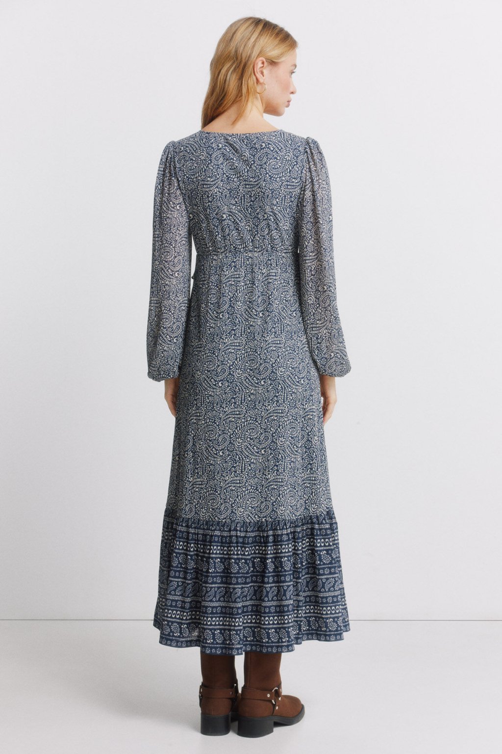 Vzorované midi šaty s dlhým rukávom, V výstrihom s mašľou, švom v páse a detailom volánov na ramenách a širokou sukňou.