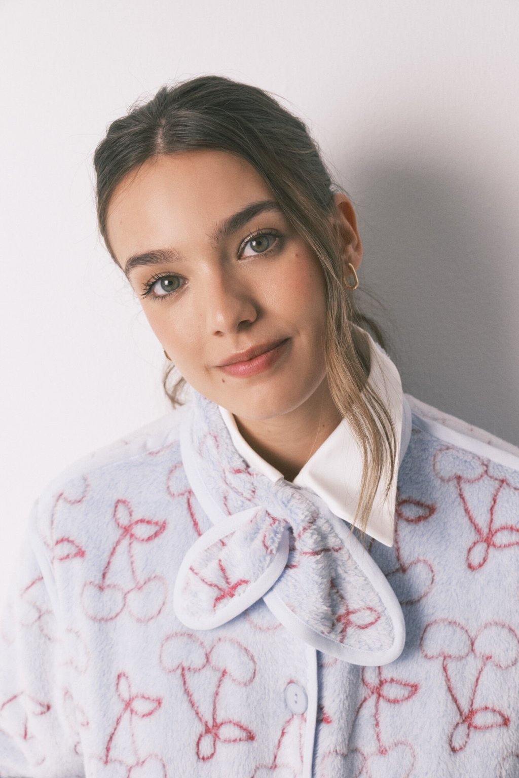 Flísová bunda s žakardovým motívom čerešní. S okrúhlym výstrihom, ladiacim detailom rúrkovania a viazaním na krku. So zapínaním na gombíky a vreckami s ladiacim rúrkovaním. Hlavný materiál obsahuje minimálne 50% recyklovaných polyesterových vlákien.