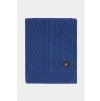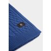 Šál z káblového úpletu. Detail ozdobného štítku. Rozmery 188 x 32 cm.
