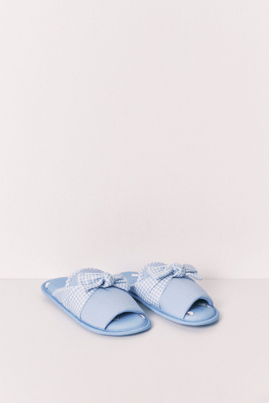 Svetlomodré papuče z textúrovaného materiálu. S dekoratívnou mašľou, kockovaným vzorom a motívom postavičiek Sanrio (Hello Kitty, Keroppi & Co.) na vnútornej strane. Skombinujte ich s ladiacim pyžamom z tej istej kolekcie.