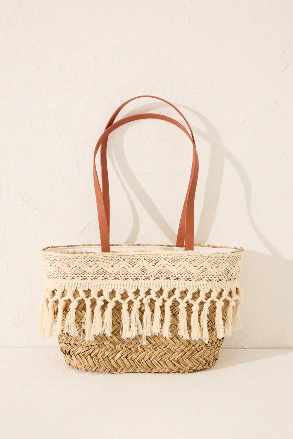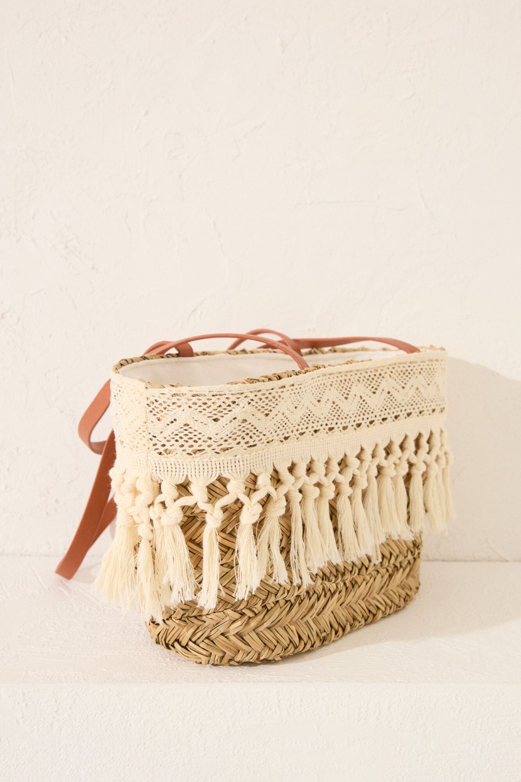 Veľká plážová taška z rafiového materiálu. S čipkovým detailom.